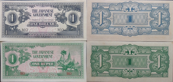 Japonská okupace 1942-45 - 1 Dollar (Malaysia) Pick.M5c, 1 Rupee (Barma) Pick.14a ...2ks