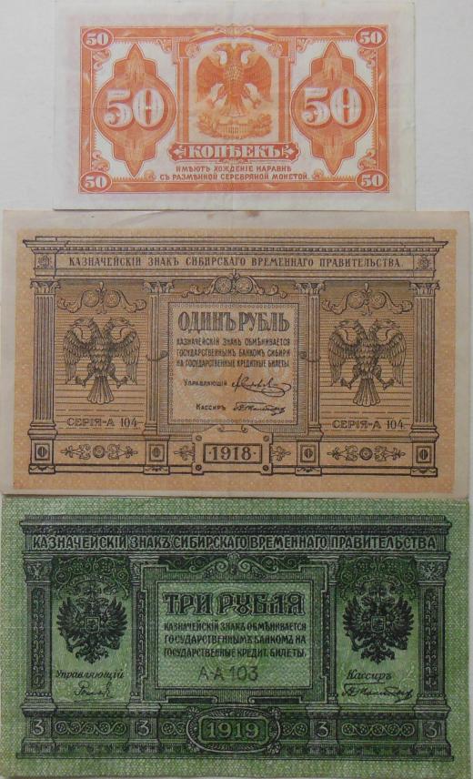 3 Rubl 1919 - S.827, s.AA103 lehce natrž, 1 Rubl 1918 - S.816, s.A104 a, 50 Kopějek, S.828 , přelož...3ks