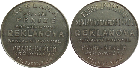 Reklamní známka - fy. Reklanova, Praha Karlín Královská 80, 34mm, slitina, nesign