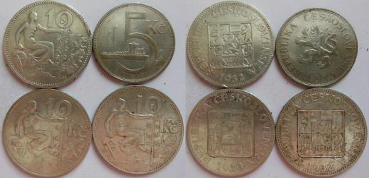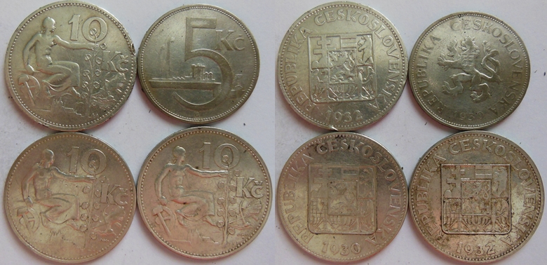 Konvolut 10 Kč 1930,32(2x)-Nov.11, 10g Ag(700/1000), a 5 Kč 1930- Nov.9, 7g Ag(500/1000), dr škr v ploše, dr hr ...4ks
