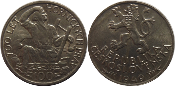 100 Kčs 1949 - Nov.47, 700.výročí jihl hornického práva, O.Španiel, Ag(500/1000), 14g