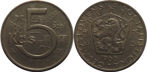 5 Korun 1966 =R= - Nov 69, varianta s většími číslicemi do oblouku