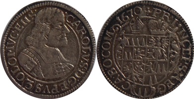 Karel II. Lichtenstein 1664-95 - 3.krejcar 1670, Kroměříž - špice, SV.326var, tečka za OLOMVCENS