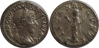 AR Denár - R:stojící Pietas s pozvednutými rukami "PIETAS AVGVSTI", R.I.C 129, .2,86g, ražba Řím 240-244, naprask ražbou