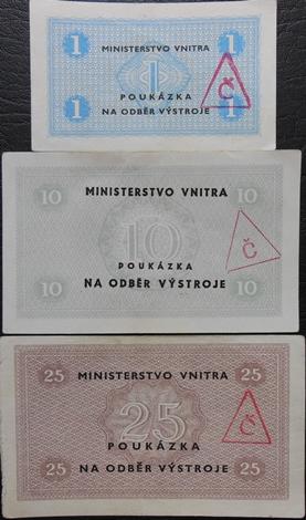 Ministerstvo vnitra - poukázky na odběr výstroje 1, 10 a 25 Kčs trojúhel. razítko s Č