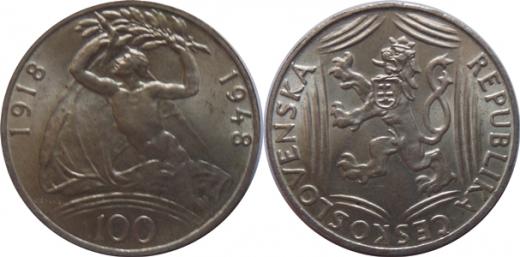 100 Kčs 1948 - Nov.46, 30.výročí vzniku ČSR, O.Španiel, Ag(500/1000), 14g