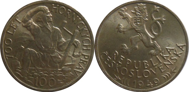 100 Kčs 1949 - Nov.47, 700.výročí jihl hornického práva, O.Španiel, Ag(500/1000), 14g