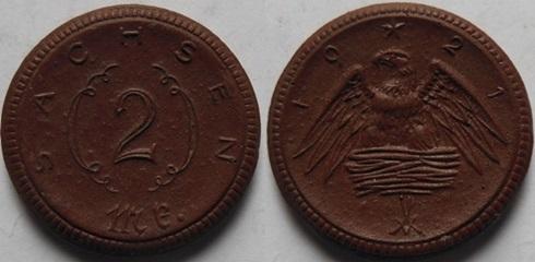 Sasko - Míšeň, 2Mk 1921, hnědý porcelán, 29mm, M-22281.20