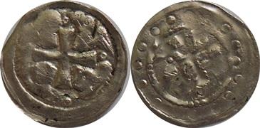 Moravský denár bez opisu - Cach.898, Av:Orlice Rev:Kříž a čtyři hlavy