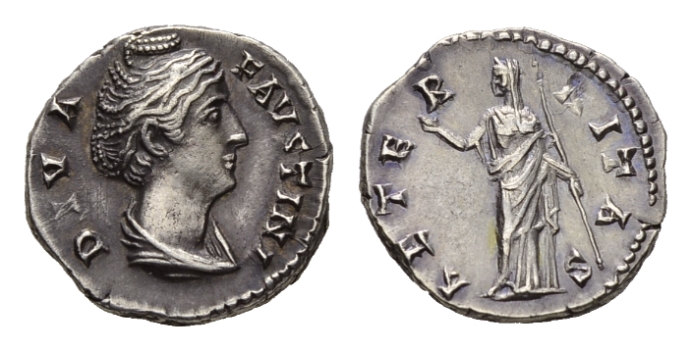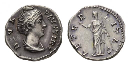 Faustina senior, wife of Antoninus Pius Denarius, after 141, AR 18mm., 3.51g. DIVA FAVSTINA Draped bust right. Rev. AETERNITAS Juno standing left, holding sceptre and raising right hand. RIC A. Pius 344. C. 26. BMC A. Pius 345.Toned and about extremely fine.