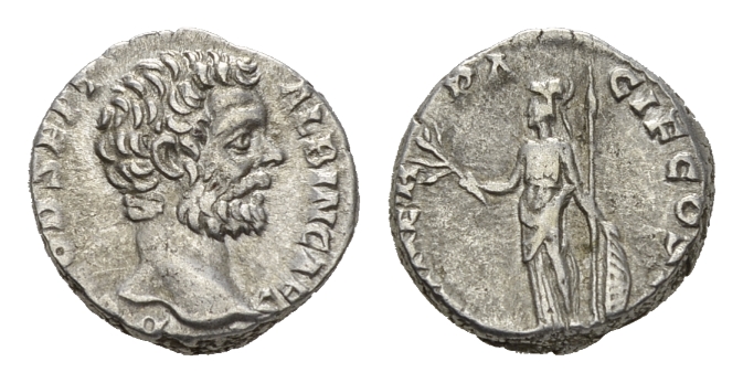 Clodius Albinus caesar, 193 – 195 Denarius, circa 193, AR 17mm., 3.50g. D CLOD SEPT ALBIN CAES Head bare right. Rev. MINER PACIF COS II Minerva standing left, holding olive branch and shield, spear against left arm. RIC 7. C 48. BMC 92Nice portait. Good very fine.