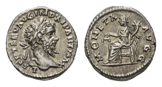 Septimius Severus, 193-211 Denarius, Laodicea ad mare circa 198 - 202, AR 18mm., 3.07g. L SEPT SEV AVG IMP XI PART MAX Laureate head right. Rev. MONETA AVGG Moneta seated left, holding scales and cornucopiae. RIC 510a. C 342. BMC pag. 177 ‡.Lightly toned and extremely fine.