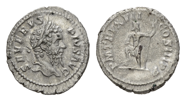 Septimius Severus, 193-211 Denarius, circa 209, AR 19.5mm., 3.33g. SEVERVS PIVS AVG Laureate head right. Rev:.P M TR P XVII COS III PP Neptune standing left, leaning on raised right leg set on globe and holding trident. RIC 228. C 529. BMC 3.Reverse weakly struck; otherwise extremely fine.