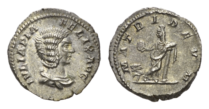 Julia Domna, wife of Septimius Severus Denarius, 211 - 217, AR 19mm., 3.43g. IVLIA PIA FELIX AVG Draped bust right. Rev. MATRI DEVM Cybele standing front, holding drum, resting left arm on column; at her feet left, lion. RIC Caracalla 383A. C. 138var. BMC Caracalla 14. Toned and extremely fine.