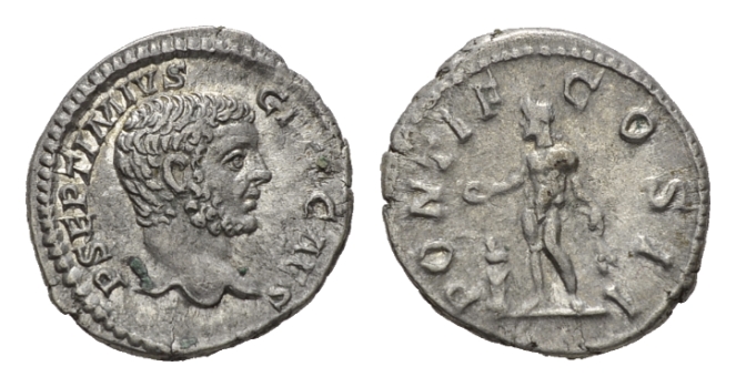 Geta, 209-212 Denarius, circa 209, AR 18mm., 3.11g. P SEPTIMIVS GETA CAES Bare head right. Rev. PONTIF COS II Genius standing left, sacrificing out of patera over lighted altar and holding cor-ears. RIC 59b. C 114. BMC 579.Reverse weakly struck; otherwise extremely fine.