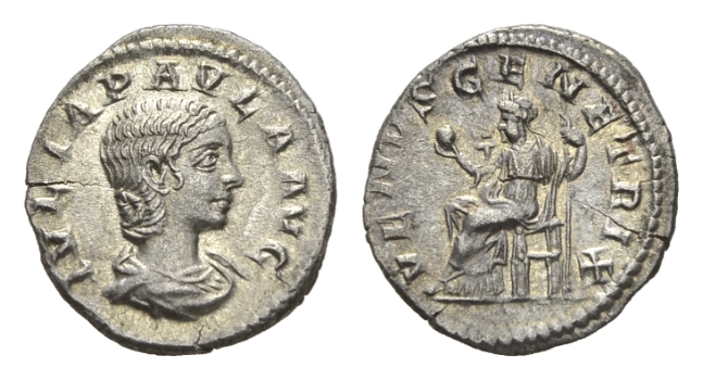 Julia Paula, wife of Elagabalus Denarius, 219 - 220, AR 18mm., 2.91g. IVLIA PAVLA AVG Draped bust right Rev. VENVS GENETRIX Venus seated left, holding globe and sceptre. RIC Elagabalus 222. C. 21. BMC Elagabalus 117.Tiny flan crack on 9 o'clock on obverse; otherwise extremely fine.