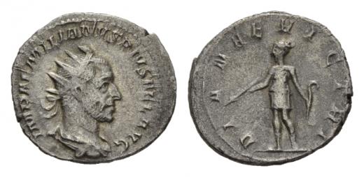 Aemilian, 253 Antoninianus, circa 253, AR 22mm., 3.20g. IMP AEMILIANVS PIVS FEL AVG Radiate, draped and cuirassed bust right. Rev.DIANAE VICTRI Diana standig left holding arrow and bow. RIC 2b. C. 9.Toned and very fine.
