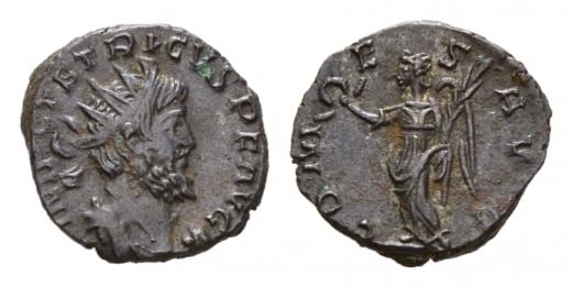 Tetricus I, 270-273 Antoninianus, Treveri circa 270 - 273, billon 18.5mm., 3.10g. IMP C TETRICVS P F AVG Radiate, draped and cuirassed bust right. Rev. COMES AVG Victory standing left, holding wreath and palm. RIC 56. C 17.Brown tone and good very fine.