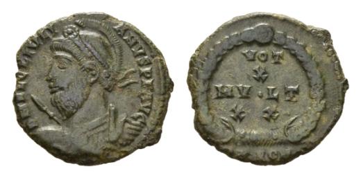 Julian II, 360-363 Æ3, Rome circa 360 - 363, Æ 19.5mm., 3.00g. D N FL CL IVLI-ANVS P F AVG Helmeted, draped and cuirassed bust left, holding spear and shield. Rev. VOT/X/MVLT/XX within laurel wreath; in exergue, VRB ROM. RIC 329. C 151. LRBC 695.Good very fine.