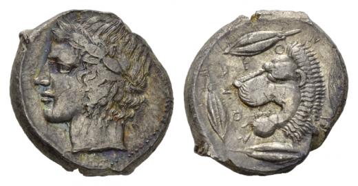 Sicily, Leontini Tetradrachm circa 430 - 425, AR 24.5mm., 17.47g. Laureate head of Apollo left. Rev. LEO-N-TI-N-ONHead of lion left. With open jaws and tongue protruding. SNG ANS 257 (these dies). Boehringer, Essays Price 55 (these dies).Minor marks on reverse; otherwise iridescent toned and about extremely fine