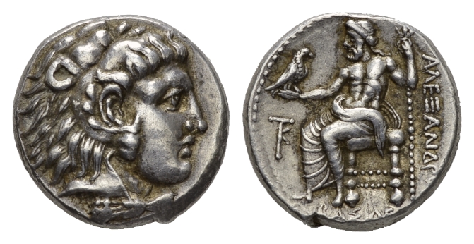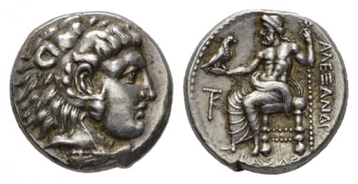 Kingdom of Macedon, Alexander III, 336 – 323 and posthumous issues Tetradrachm circa 325 - 320, AR 24.5mm., 17.10g. Head of young Heracles right, wearing lion’s skin. Rev. ΑΛΕΞΑΝΔΡΟΥ Zeus seated on throne left, holding eagle and sceptre; in outer l. field, TK ligate. In exergue, ΒΑΣΙΛΕΩΣ. Price 3107. Müller 1294.Toned and about extremely fine.