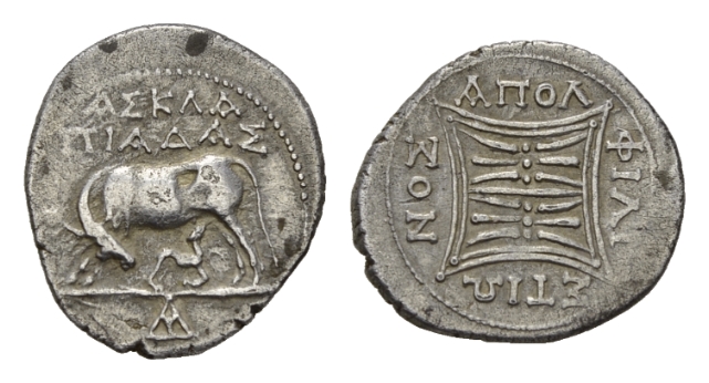 Illyricum, Apollonia Drachm circa 280 - 80, AR 18.5mm., 3.21g. Asklepiadas, magistrate AΣKΛA/ΠIAΔAΣ Cow standing left, suckling calf standing right; in exergue, monogram. Rev. Double stellate pattern; ΑΠOΛ and ΛY–ΣA–NIA around. SNG Copenhagen 392.Very fine/good very fine.