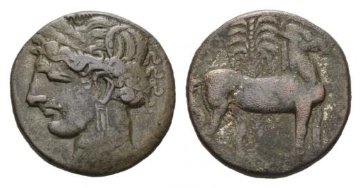 Zeugitania, Carthago Double Shekel circa 264 - 241, billon 25.5mm., 10.84g. Head of Tanit left, wearing triple pendant earring and necklace; in hair, grain ears. Rev. Horse standing right, behind, palm. SNG Copenhagen 190. Müller 104. SNG Lockett 1071.About very fine/fine.