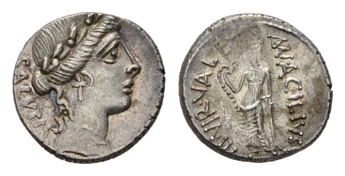 Mn. Acilius Glabrio Denarius circa 49, AR 18mm., 3.99g. SALVTIS (downwards) Laureate head of Salus right Rev. MN·ACILIVS – III·VIR·VALETV Valetudo standing left, resting l. arm on column and holding snake in r. hand. Babelon Acilia 8a. Sydenham 922. Sear Imperators 16. Crawford 442/1b.Lightly toned, minor area of weakness on reverse otherwise, good extremely fine.Ex Nomisma sale 20, 2002, 42.