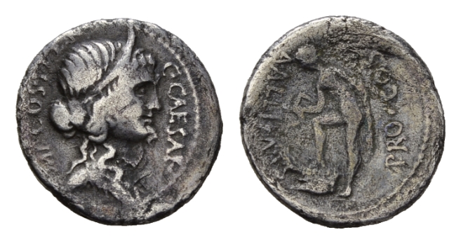 Julius Caesar and A. Allienus. Sicily Denarius circa 47, AR 19mm., 3.52g. C·CAESAR – IMP·COS·ITER Diademed and draped bust of Venus right. Rev. A·ALLIENVS – PRO·COS Trinacrus standing left, placing r. foot on prow, holding trisceles in r. hand and cloak in l. Babelon Julia 14 and Alliena 1. C 1. Sydenham 1022. Sear Imperators 5Very rare. Banker's mark on obv.; otherwise toned and good fine.