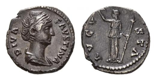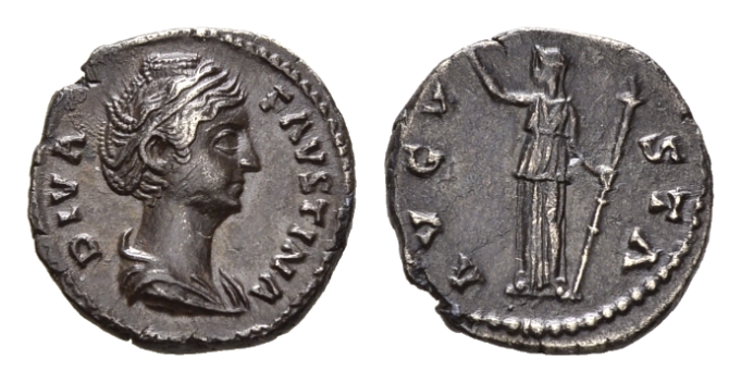 Faustina senior, wife of Antoninus Pius Denarius circa 141, AR 18mm., 3.06g. DIVA FAVSTINA Draped and veiled bust right. Rev. AETERNITAS Providentia standing left holding globe, veil blown out behind head . RIC A. Pius 351b. C. 33. BMC A. Pius 379.Good very fine.