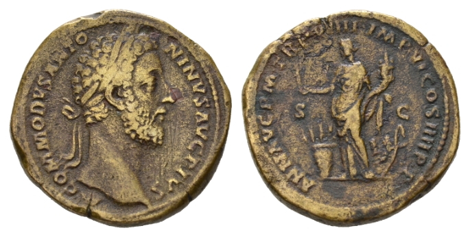 Commodus, 177-192 Sestertius circa 183-184, Æ 33mm., 28.37g. M COMMODVS ANTONINVS AVG PIVS Lureate head right. Rev. ANN AVG TR P VIIII IMP VI COS IIII PP. Annona standing left holding statuette of Concordia and cornucopiae; to left modius and corn-ears, to right ship. RIC 416. C. 15. BMC 523.Brow tone and about very fine.