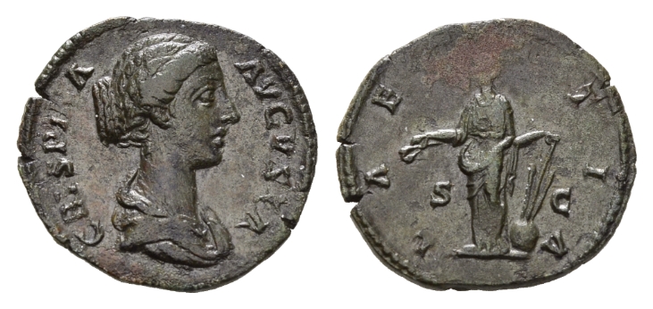 Crispina, wife of Commodus Dupondius circa 180-183, Æ 26.5mm., 9.46g. CRISPINA AVGVSTA Draped bust right. Rev. LAETITIA Laetitia standing left, holding wreath and rudder on globe. RIC Commodus 683. C 28. BMC Commodus 435.Dark green patina and good very fine.