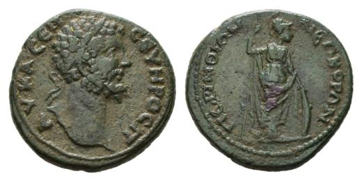 Septimius Severus, 193-211 Bronze circa 193-211, Æ 29mm., 13.98g. AV K CE? CEVHPOC ? Laureate head right. Rev. ?EPIN?I?N NE?KOP?N Athena standing right, holding spear and shield. Schönert-Geiss - cf 482.Green patina and good very fine.