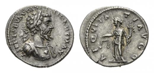 Septimius Severus, 193-211 Denarius circa 198-200, AR 18.5mm., 3.00g. L SEPT SEV AVG IMP XI PART MAX Laureate head right. Rev. AEQVITA – TI AVGG Aequitas standing left holding scales and cornucopiae. RIC 122c. C. 21. BMC 122.Tone and extremely fine.