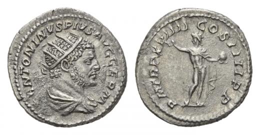 Caracalla, 198-217 Antoninianus circa 215, AR 23.5mm., 5.05g. ANTONINVS PIVS AVG GERM Radiate and draped bust right. Rev. P M TR P XVIIII COS IIII P P Sol standing left, raising right hand and holding globe. RIC 264b. C 287. BMC 135 note.Good extremely fine.