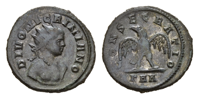 Divo Nigriniano, son of Carinus Antoninianus circa 284-285, Æ 22.5mm., 4.31g. DIVO NIGRINIANO Radiate half bust right. Rev. CONSECRATIO Eagle standing facing with spread wings, head l. In exergue, KAA. C 2. RIC 472.Very Rare. An enchanting portrait struck on a very broad flan. Green patina with some silvering. Extremely fine.The coinage of Nigrinian, the son of Carinus who died in childhood, is limited to gold aurei (which are exceedingly rare) and billon Aurelianianii which, despite the large finds from this period, are still rare and elusive. We are fortunate that this piec