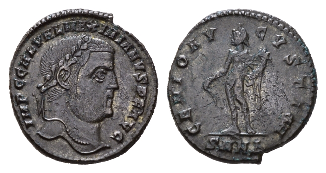 Galerius Maximianus, 305-311 Follis Nicomedia circa 308-306, - 25mm., 8.57g. IMP C GAL VAL MAXIMIANVS P F AVG Laureate head right. GENIO AVGVST CMH (ligate) Genio standing left holding patera and cornucopiae; in exergue, SMN?. RIC 54a.Good very fine/very fine.