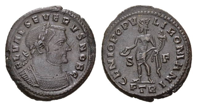 Severus II Caesar, 305 – 306 Follis Treveri circa 305-306, Æ 27mm., 10.03g. FL VAL SEVERVS NOB C Laureate and cuirassed bust right. Rev. GENIO POPVLI ROMANI Genio standing left, holding patera and cornucopiae; in field S-F and in exergue PTR. RIC 667a. C. 92. Brown patina and extremely fine.Brown tone and about extremely fine.