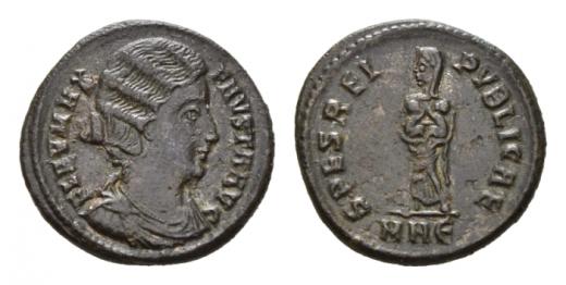 Fausta, wife of Constantine Follis Nicomedia circa 325-326, Æ 19.5mm., 3.21g. FLAV MAX FAVSTA AVG Draped bust right. Rev. SPES REI PVBLICA Empress standing left, holding two children, in exergue, MNE. RIC 131.Good very fine.Ex Forum Ancient Coins.