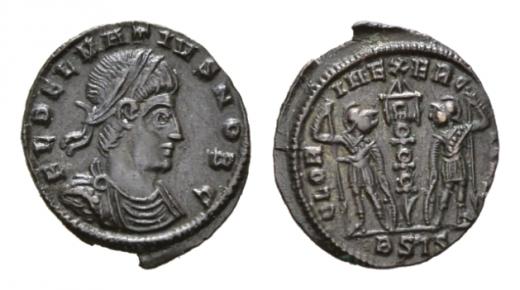 Delmatius caesar, 335-337 Follis Siscia circa 336-337, Æ 16mm., 1.31g. FL DELMATIVS NOB C Laureate, draped and cuirassed bust right. Rev. GLORIA EXERCITVS Two soldiers standing facing, heads toward one another, each holding spear; between them, signum. In exergue, BSIS. RIC 256. LRBC 758.Brown tone and extremely fine.
