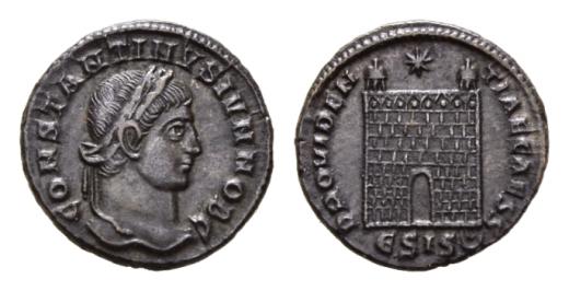 Constantine II Caesar, 317-337 Follis Siscia circa 324 - 325, Æ 18.5mm., 3.05g. CONSTANTIVS NOB C Laureate bust right. Rev. PROVIDENTIAE CAESS Campgate; in exergue, ESIS. RIC 185.Good very fine.Ex Nomisma 23, 2003, 1790.