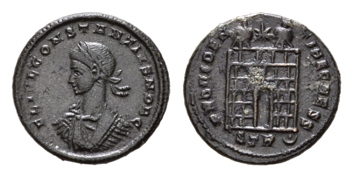 Constantius II, 337-361 Follis Trier circa 326, Æ 19mm., 3.59g. FL IVL CONSTANTIVS NOB C Laureate, draped and cuirassed bust right. Rev. PROVIDENTIAE CAESS Campgate; in exergue STR. RIC 480.Good very fine.