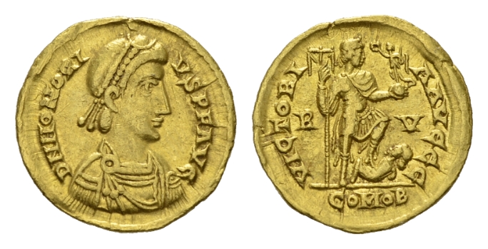 Honorius, 393-423 Solidus Ravenna circa 408-422, AV 21mm., 4.44g. D N HONORI – VS P F AVG Pearl-diademed, draped and cuirassed bust r. Rev. VICTORI – A AVGGG R – V Emperor standing r., holding standard in r. hand and Victory on globe in l., spurning captive with his l. foot. In exergue, COMOB. RIC 1326. C 44. Depeyrot 7Good very fine.