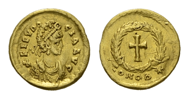 Aelia Eudocia, wife of Theodosius II Tremissis Constantinopolis circa 423-442, AV 13.5mm., 1.30g. AEL EVDO – CIA AVG Pearl-diademed and draped bust right, wearing pearl necklace. Rev. Cross within wreath; in exergue, CONOB *. RIC 253. MIRB Theodosius II, 50. LRC 461. Depeyrot 72/2.Very fine.