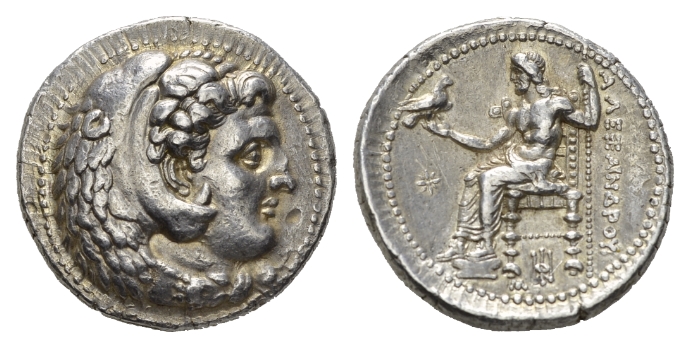 Kingdom of Macedon, Tetradrachm circa 325-323, AR 28.5mm., 17.18g. Head of Heracles right, wearing lion’s skin. Rev. AΛEΞANDROY Zeus seated on throne left, holding sceptre in his l. hand and eagle on his outstretched r.; in l. field, star; below throne, monogram. Price 3632.Extremely fine.