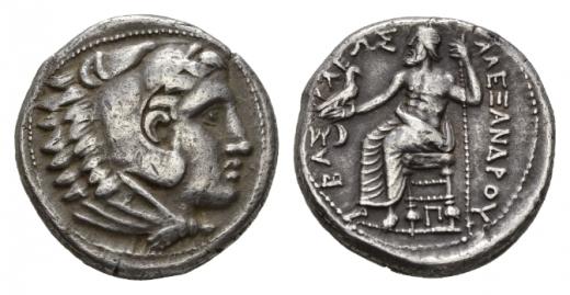 Kingdom of Macedon, Tetradrachm circa 320-317., AR 26.5mm., 17.14g. Head of Heracles right, wearing lion’s skin. Rev. BAΣIΛEΩΣ AΛEΞANDROY Zeus seated on throne left, holding sceptre in his l. hand and eagle on his outstretched r.; in l. field, star; below throne, monogram. Price 123.Very fine.Ex NAC sale R, May 2007, 117.