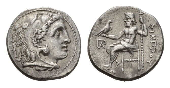 Kingdom of Macedon, Drachm circa 323-319, AR 17.5mm., 4.24g. Head of Heracles right, wearing lion’s skin. Rev. ΦIΛIΠΠOY Zeus seated on throne left, holding eagle on his r. hand and sceptre in l.; before, monogram. Price P 46.Very fine.Ex NAC sale 64, May 2012, 2196.