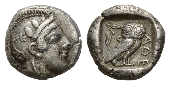 Attica, Athens Tetradrachm circa 459-449., AR 24mm., 16.93g. Attica, Tetradrachm Tetradrachm circa 415-400, AR 24.5 mm, 17.00 g. Head of Athena right, wearing crested helmet, earring and necklace; bowl ornamented with spiral and three olive leaves. Rev. ΑΘΕ Owl standing right, head facing; in upper field l., olive Good very fine.