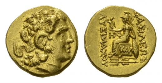 Kingdom of Pontus, Stater circa 88-86, AV 19.5mm., 8.20g. Diademed head of deified Alexander III right, resembling Mithridates, with horn of Ammon. Rev. ΒΑΣΙΛΕΩΣ ΛΥΣΙΜΑΧΟΥ Athena seated left, holding Nike in right hand, resting left arm on shield, transverse spear behind, in inner left field, monogram and under Extremely fine.Ex NAC sale R, May 2007, 1163.