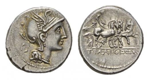 T. Mal. And Ap. Cl. Denarius circa 111-110, AR 18mm., 4.01g. Helmeted head of Roma right; behind, quadrangular device. Rev. Victory in fast triga right, holding reins in both hands. In exergue, T·MAL·AP.CL·Q·VR. B. Mallia 2 and Claudia 3. Sydenham 570a. Crawford 299/1b.Extremely fine.Ex NAC sale 29, May 2005, 310.